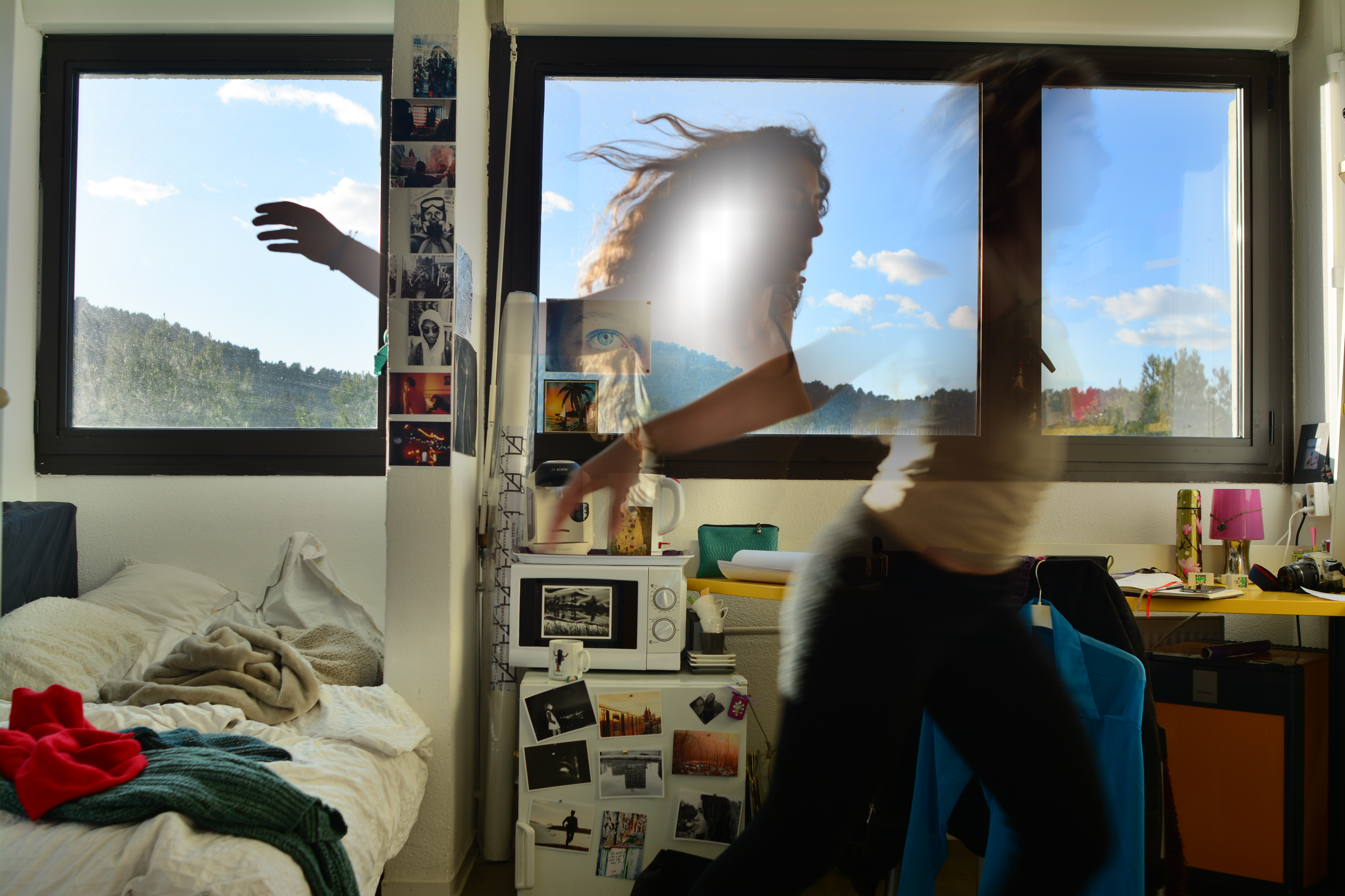 By taking the limited and standardized space of the university room as a space for photographic travel, I have built a series on the principle of unity and variation. How do bodies and objects inhabit the intimate space through their presence ?